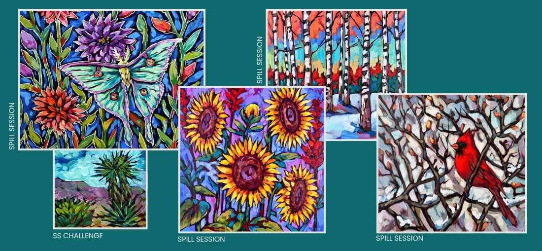 Spill Sessions are the heart of our membership! They are shorter, focused painting lessons designed to explore one single composition at a time. Each session painting tutorial typically consists of 2-4 parts, allowing you to move through one painting in clear, manageable stages without the overwhelm.